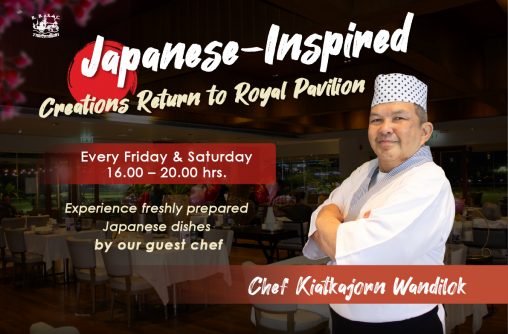 Read moreExperience authentic Japanese flavors craft by Chef Kiatkajorn Wandilok Every Friday & Saturday from 4 p.m. – 8 p.m. at Royal Pavilion ขอเชิญทุกท่านร่วมเปิดประสบการณ์อาหารญี่ปุ่นต้นตำรับกับ เชฟ เกียรติขจร วรรณดิลกณ ห้องรอยัล พาวิลเลี่ยน ทุกวันศุกร์และเสาร์ ตั้งแต่เวลา 16.00 น. – 20.00 น.พบกับเมนูพิเศษที่คัดสรรวัตถุดิบคุณภาพ ถ่ายทอดรสชาติและศิลปะการปรุงอาหารแบบญี่ปุ่นอย่างพิถีพิถัน เพื่อมอบช่วงเวลาแห่งความอร่อยและความประทับใจแก่ท่าน