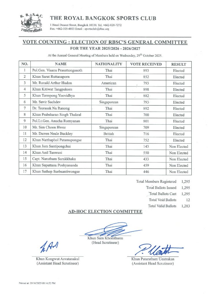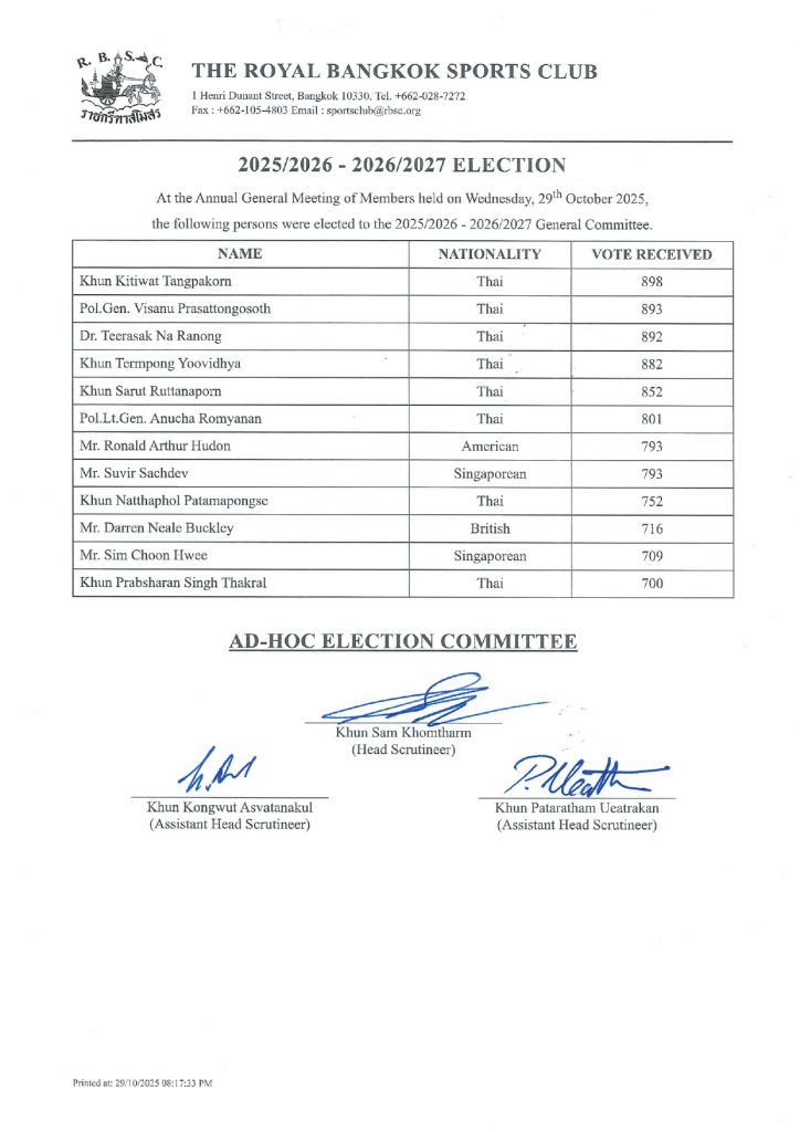 The following were the results of the General Committee Election held at the Henri Dunant Hall on 29th October 2025 from 8:30 a.m. – 6:30 p.m. for the term 2025/2026 – 2026/2027.