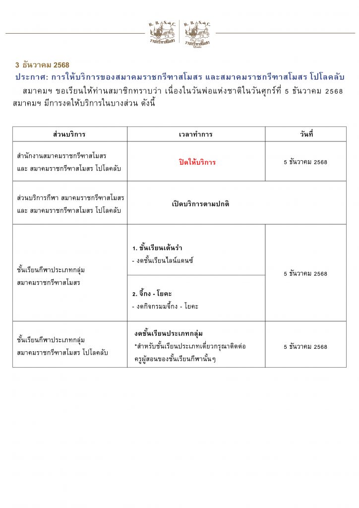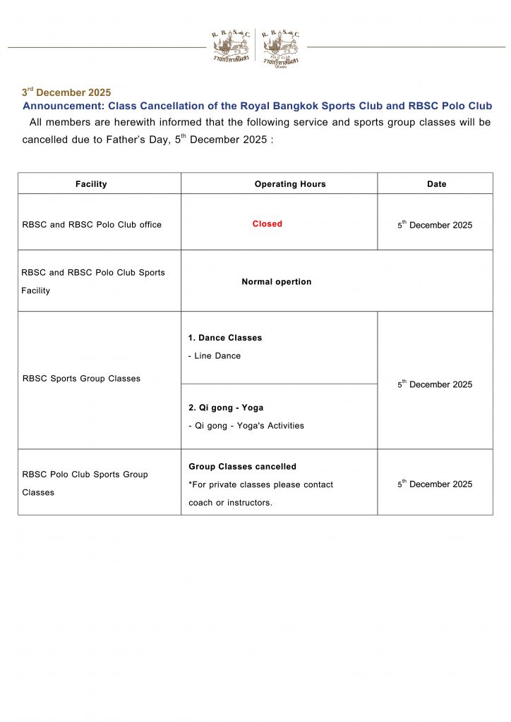Announcement :: Class Cancellation of the Royal Bangkok Sports Club And RBSC Polo Club