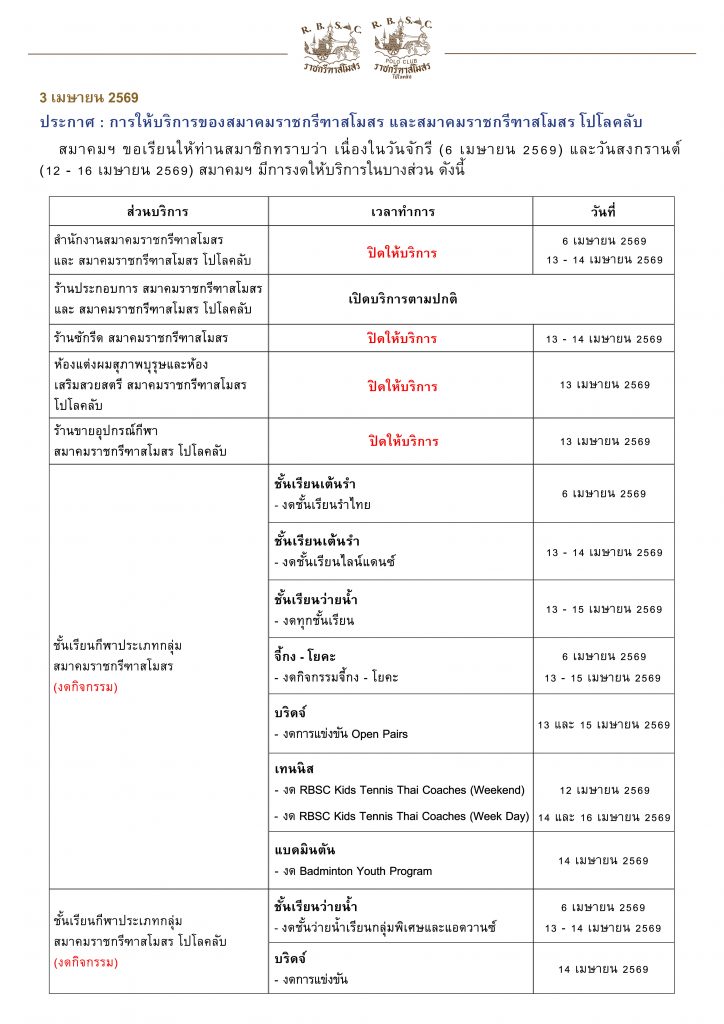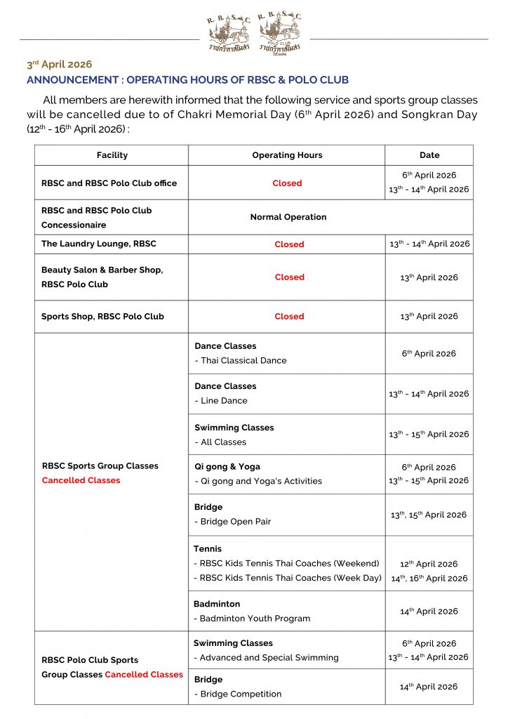 All members are herewith informed that the following service and sports group classes will be cancelled due to of Chakri Memorial Day (6th April 2026) and Songkran Day (12th – 16th April 2026) :