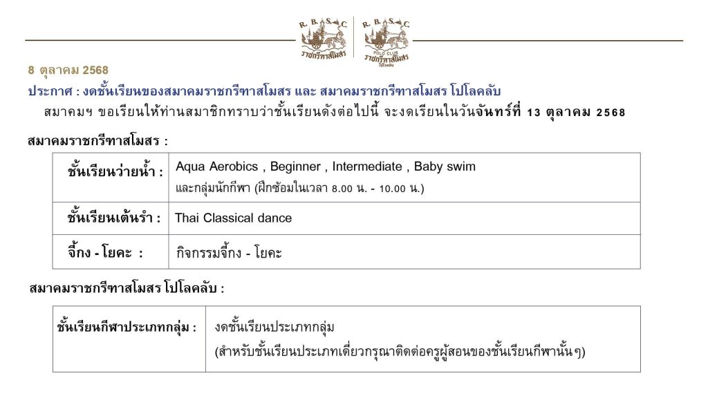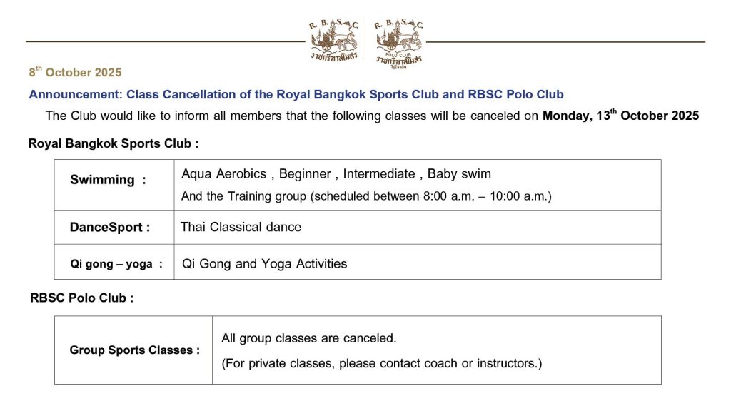 All members are herewith inform that the following service and Sports group classes will be cancelled on Monday, 13th October 2025 due to King Rama IX Memorial Day :