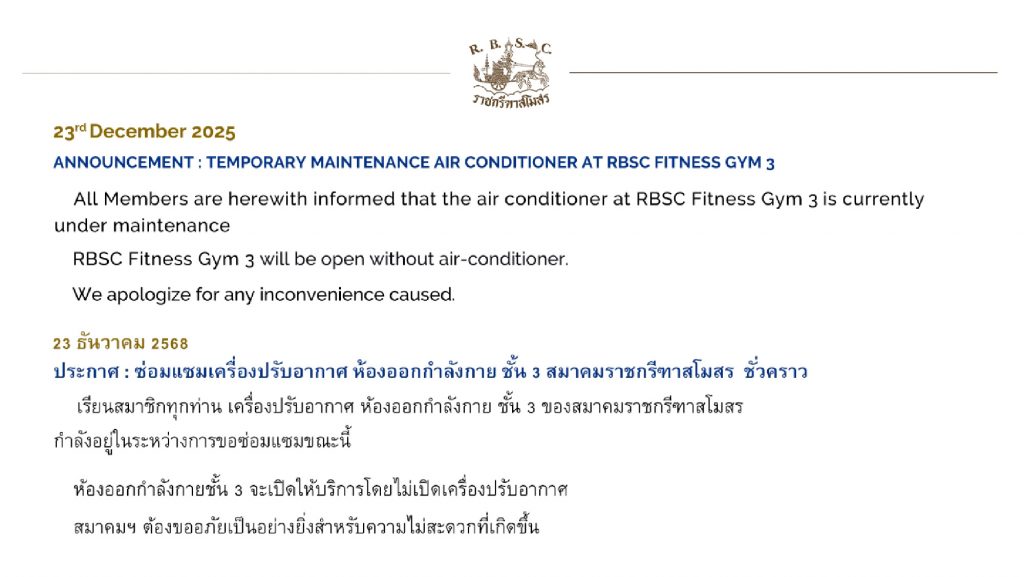 เรียนสมาชิกทุกท่าน เครื่องปรับอากาศ ห้องออกกำลังกาย ชั้น 3 ของสมาคมราชกรีฑาสโมสรกำลังอยู่ในระหว่างการขอซ่อมแซมขณะนี้