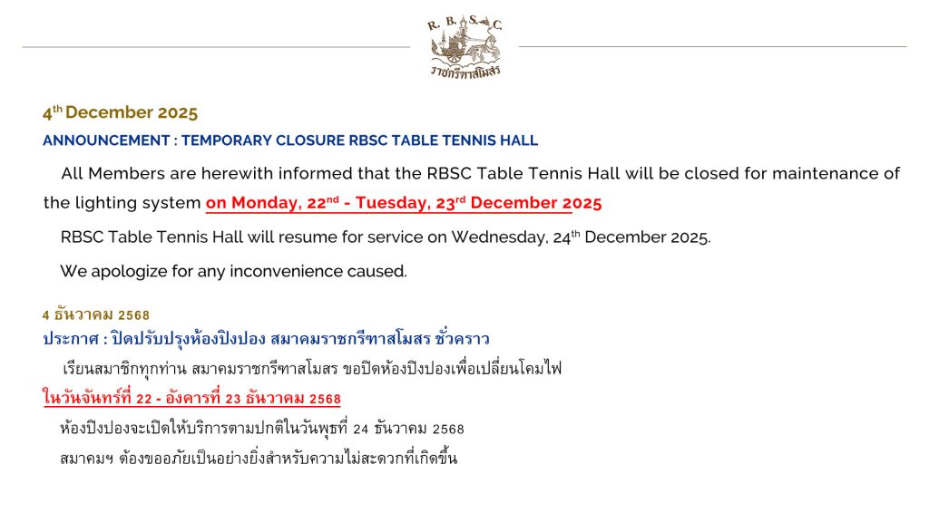 All Members are herewith informed that the RBSC Table Tennis Hall will be closed for maintenance of the lighting system on Monday, 22nd – Tuesday, 23rd December 2025