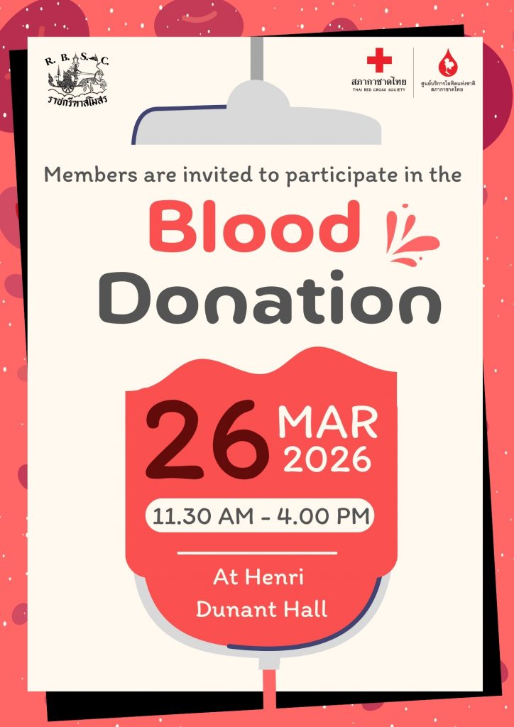 The Club would like to invite all members and RBSC staff to the annual blood donation event, taking place at Henri Dunant Hall on Wednesday, 26th March 2026, from 11:30 a.m. to 4:00 p.m.