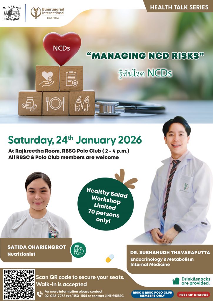 Members are cordially invited to attend a lecture covering the following topics: “Managing NCD Risks” by Dr. Subhanudh Thavaraputta from Bumrungrad International Hospital on Saturday, 24th January 2026, from 2 p.m. onwards at Rajkreetha Hall, RBSC Polo Club.