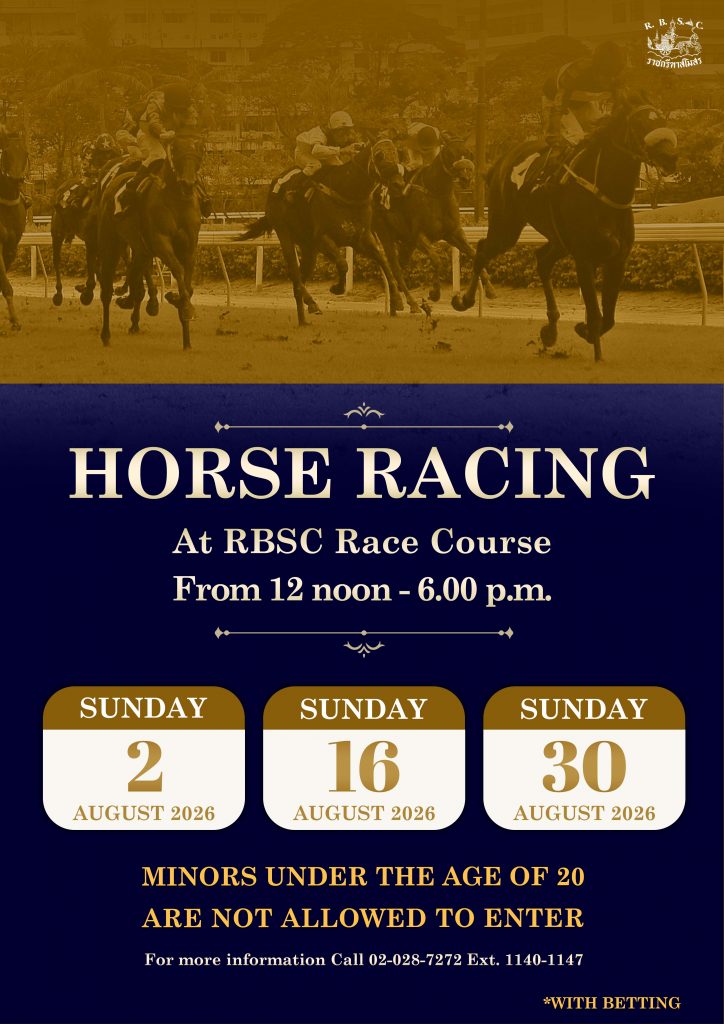 การแข่งม้าในเดือนสิงหาคมจะจัดขึ้นในวันอาทิตย์ที่ 2 วันอาทิตย์ที่ 16 และวันอาทิตย์ที่ 30 สิงหาคม 2569 สอบถามข้อมูลเพิ่มเติมที่ 02 028 7272 ต่อ 1140-1147