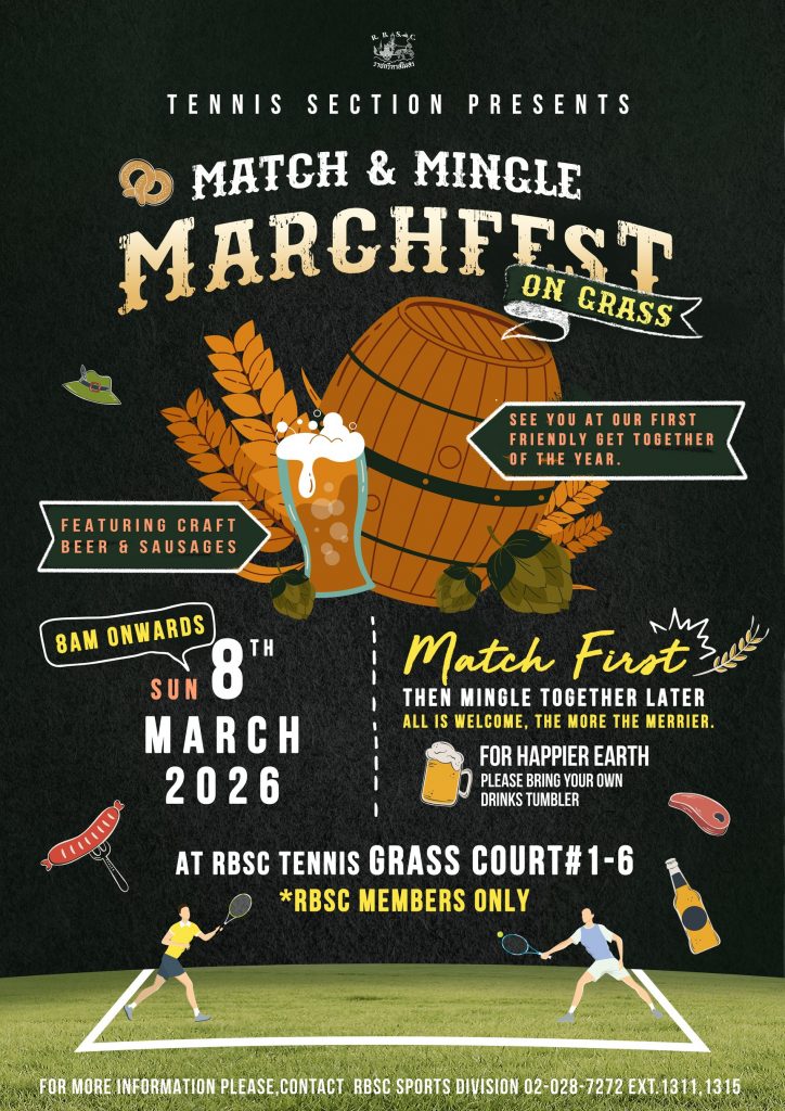 The RBSC Tennis Section cordially invites all members to participate in the prestigious “Match & Mingle Marchfest.” This exciting event will be held on 8 March 2026 at the Tennis Grass Court, starting from 8:00 a.m. onwards.
