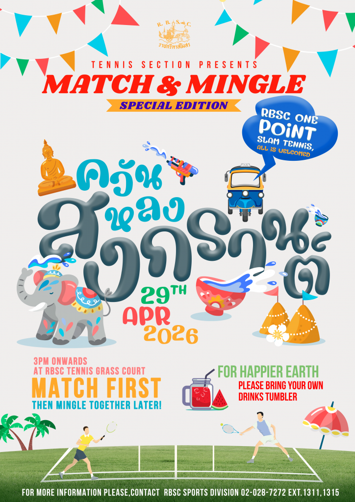 The RBSC Tennis Section cordially invites all members to participate in the prestigious “Match & Mingle special edition Post-Songkran Party” This exciting event will be held on 29th April 2026 at the Tennis Grass Court, starting from 3:00 p.m. onwards.