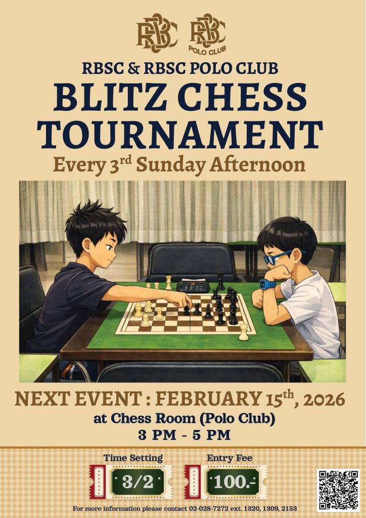 RBSC & RBSC Polo Club cordially invites members to join our upcoming Blitz Chess Tournament – a day of strategic thinking, friendly competition, and great fun! on Sunday, 15th February 2026 from 3 p.m. – 6 p.m. at Chess Room Polo Club