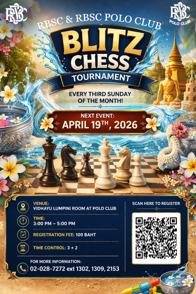 พร้อมหรือยังกับความท้าทายที่ต้องใช้ไหวพริบและความรวดเร็ว RBSC และ RBSC Polo Club ขอเชิญชวนทุกท่านเข้าร่วมการแข่งขัน Blitz Chess Tournament