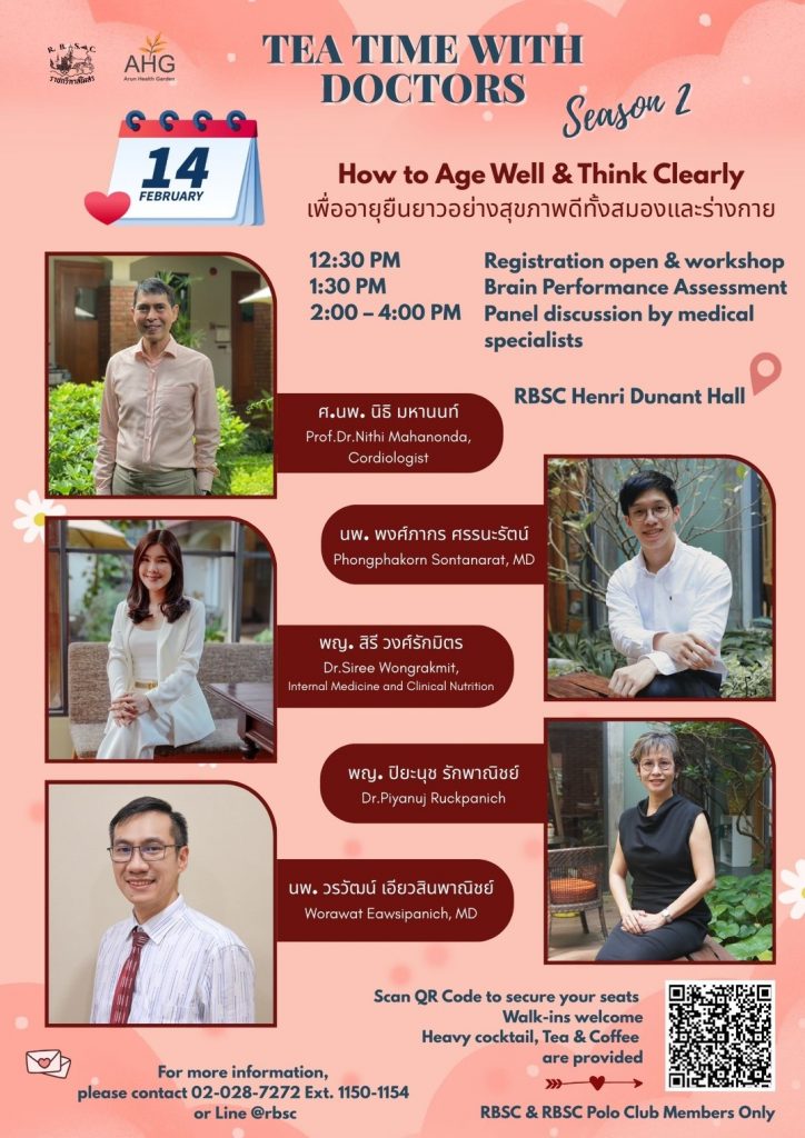 The Royal Bangkok Sports Club, in collaboration with Arun Health Garden (AHG), cordially invites members to an exclusive health seminar titled “How to Age Well & Think Clearly.” Join our panel of distinguished medical specialists as they share in-depth insights into holistic healthcare and strategies for achieving a long, vibrant, and energetic life. Saturday, 14th February 2026 at Henri Dunant Hall.