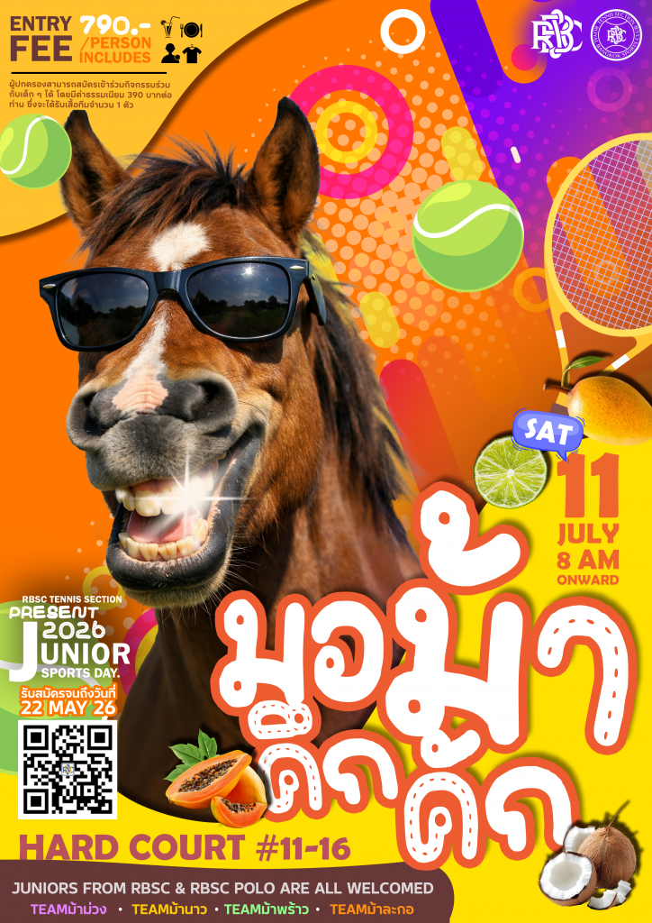 แผนกกีฬาเทนนิส ขอเชิญเด็กๆ ร่วมสนุกในงาน Tennis Junior Sports Day 2026 ปีนี้มาในธีม “มอม้าคึกคัก” ในวันเสาร์ที่ 11 กรกฎาคม 2569 เวลา 08.00 น. เป็นต้นไป ณ สนามเทนนิส Hard Court หมายเลข 11-16