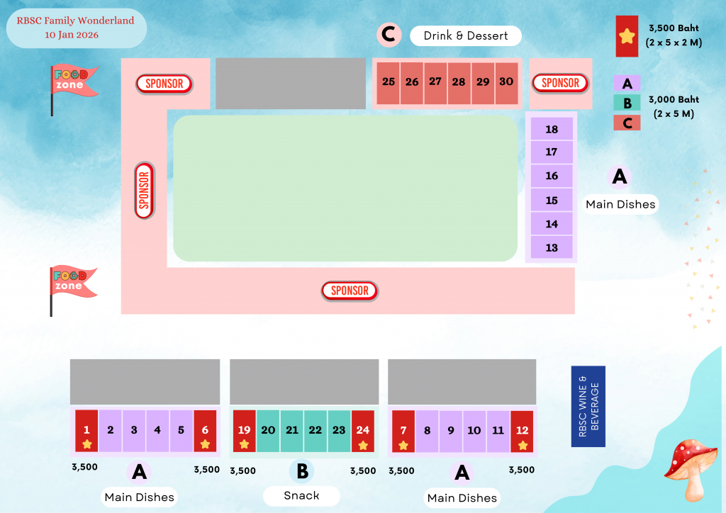 1. Beginning Monday, September 1, 2025, at 10:00 a.m., the Royal Bangkok Sports Club (“RBSC”) will accept online applications from outside vendors to use its area for food and beverage sellers at the Family Day event (“Vendors”). Food zones will be separated into: