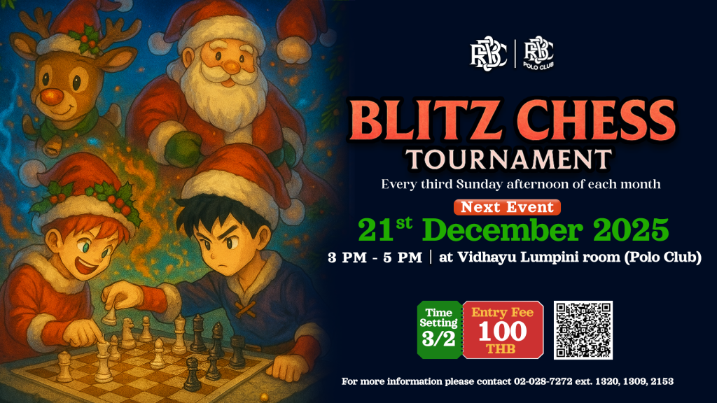 RBSC & RBSC Polo Club cordially invites members to join our upcomingBlitz Chess Tournament – a day of strategic thinking, friendly competition, and great fun! Start Sunday, 21st December 2025 from 3 p.m. – 5 p.m. at Vidhayu Loompini Room, RBSC…