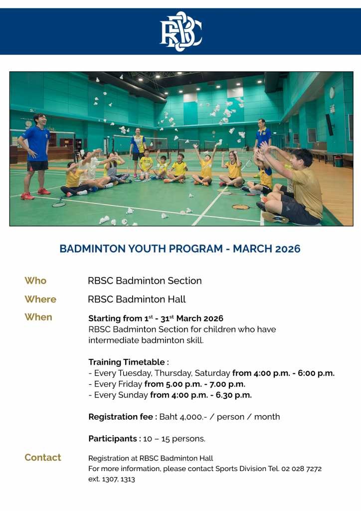 Registration at RBSC Badminton Hall For more information, please contact Sports office Tel 02 028 7272 ext. 1307, 1313