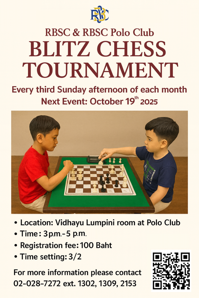 Blitz Chess Tournament – a day of strategic thinking, friendly competition, and great fun! Start Sunday, 19th October 2025 from 3 p.m. – 5 p.m. at Vidhayu Loompini Room, RBSC Polo Club