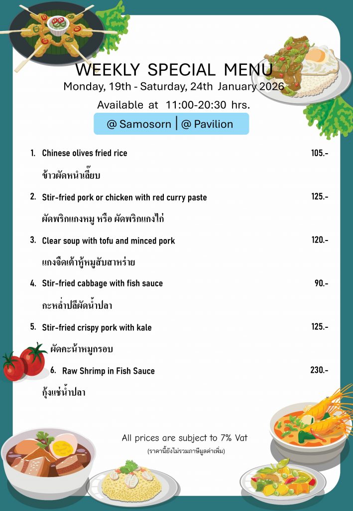 Daily Luncheon Menu at Samosorn & Pavillion