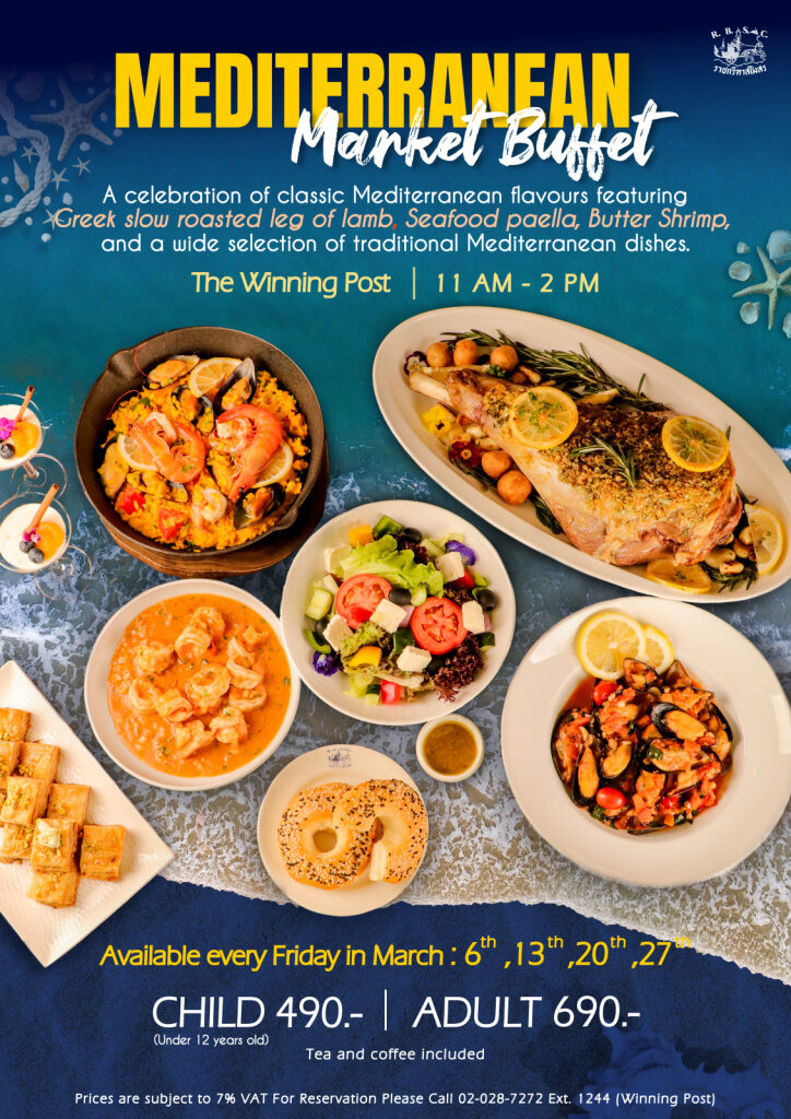 A celebration of classic Mediterranean flavours featuring Greek slow roasted leg of lamb, Seafood paella, Butter Shrimp, and a wide selection of traditional Mediterranean dishes.