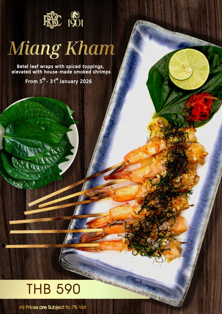 Betel leaf wraps with spiced topping elevated with house-made smoked shrimps.