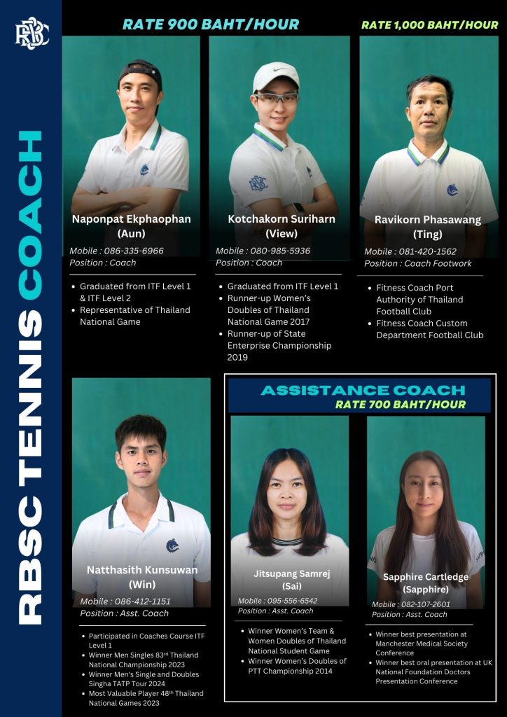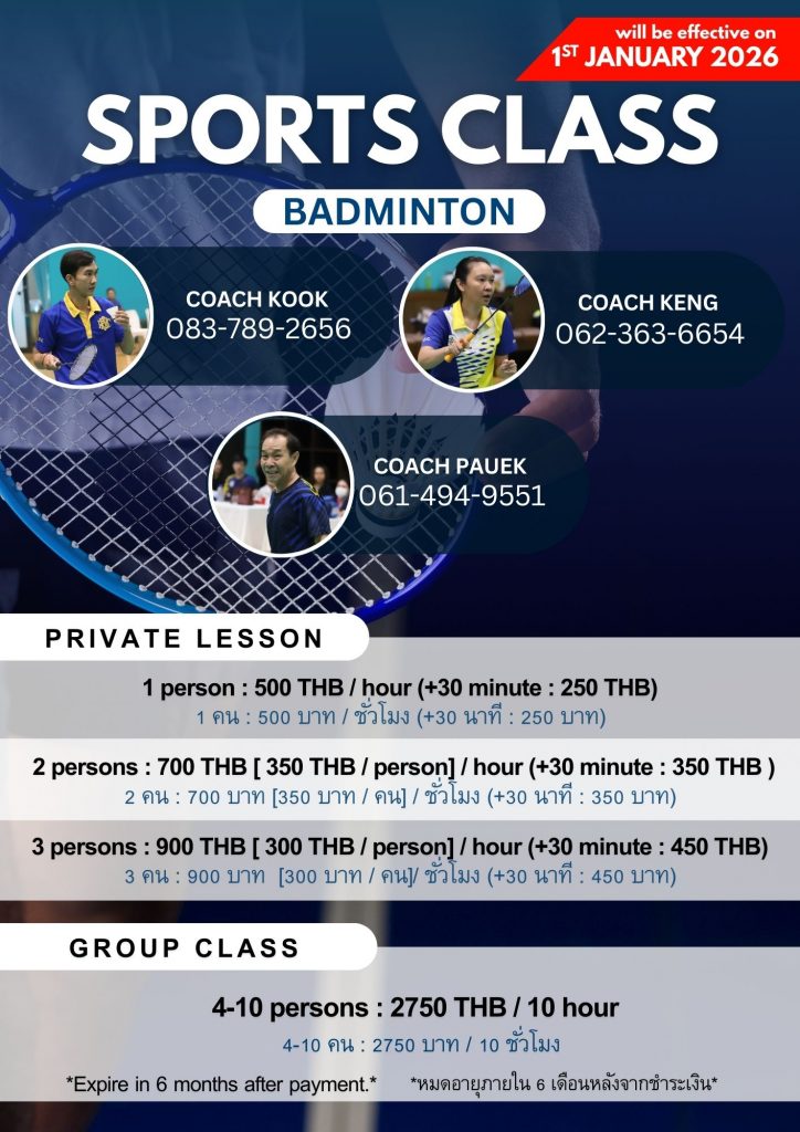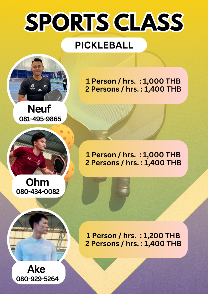 To schedule sports instruction, please contact the instructors. Sports classes are exclusive to members only. ติดต่อครูผู้สอนหากต้องการนัดหมายชั้นเรียน ชั้นเรียนกีฬาสำหรับสมาชิกเท่านั้น