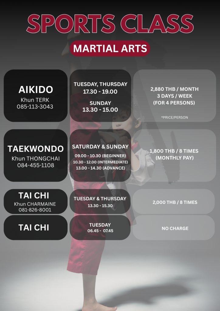 Class Time/Period Instructors Contact Balance & Stability Class Mon (9 a.m. – 11 a.m.)Coach Pasansanee (Sunny) 081-441-8119 Line Dancing Training Class Mon : 7.30 a.m. – 9.30 a.m. : 11 a.m. – 1 p.m. : 2.30 p.m. – 4.30 p.m. : 5 p.m. – 7 p.m.Coach Chintana (Chin) 089-798-9817 Wed : 7.30 a.m. – 9.30 a.m. : 2.30 p.m. – 4.30 p.m. : 9.30 a.m. – 12.30 p.m.Coach Chintana (Chin) 089-798-9817 Thu (9.30 a.m. – 12.30 p.m.)Coach Chintana (Chin) 089-798-9817 Zumba Class Tue (5 p.m. – 6 p.m.)Coach Yodchai 081-825-9041 Thu (4 p.m. – 5.30 p.m.)Coach Yodchai 081-825-9041 Zumba Gold Class Tue (4 p.m. – 5 p.m.)Coach Yodchai 081-825-9041 Dancerise for All Class Fri (2.30 p.m. – 3.30 p.m.)Coach Yodchai 081-825-9041 Zumba Fitness Class Fri (3.30 p.m. – 4.30 p.m.)Coach Yodchai 081-825-9041 Pilates/Yoga Fri (9.30 a.m. – 10.30 a.m.)Coach Prapasiri 081-617-8179 Yoga Class (II) Mon (9.30 a.m. – 11.30 a.m.)Coach Prapasiri 081-617-8179 Tae Kwon Do Lesson Sat & Sun (10 a.m. – 11 a.m.) Group 3-6 Years oldCoach Paiboon 089-896-9299 Sat & Sun (11 a.m. – 12.30 p.m.) Group 6 Years and overCoach Paiboon 089-896-9299