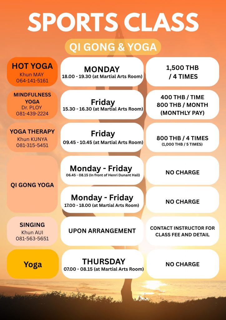 Class Time/Period Instructors Contact Ramthai (Standard Thai Dance) Mon (12.30 p.m. – 2 p.m.)ครูวิภา(จิ๋ว) 081-841-3699 Basic Thai Classic Dance Mon (2 p.m. – 3.30 p.m.)ครูวิภา(จิ๋ว) 081-841-3699 Variety Dances Wed (12 noon – 1 p.m.)Coach Treemeen (lff) 089-698-7117 Solo Latin Dances (II) Wed (1 p.m. – 2 p.m.)Coach Treemeen (lff) 089-698-7117 Dance for Health Tue (10.30 a.m. – 12 noon)Coach Treemeen (lff) 089-698-7117 Street Dance Class Thu (12.30 p.m. – 2 p.m.)Coach Chanittha (beam) 082-692-4694 Polo Dance Troupe Thu (2.15 p.m. – 3.45 p.m.)Coach Supparat (Jeab) 081-829-9788 Advance Dancing Class (I) Tue (10 a.m. – 12 noon) Coach Janyawat (Noi) 081-927-8187 Advance Dancing Class (II) Thu (10 a.m. – 12 noon) Coach Janyawat (Noi) 081-927-8187 Chinese Dance Fri (9 a.m. – 10.30 a.m.)Sports Division 02-028-7272 ext.1312